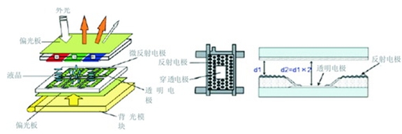 半穿透型高畫質全彩液晶顯示器的反射電極部位光線穿透率會降低,其結果造成背光照明模塊的畫面輝度降低,不過外部光線一旦變亮,利用外部光線的射入,反射電極部位的輝度會提升,因此半穿透型液晶顯示器在任何外部光線環(huán)境下,都可以維持一定的畫面識別性。