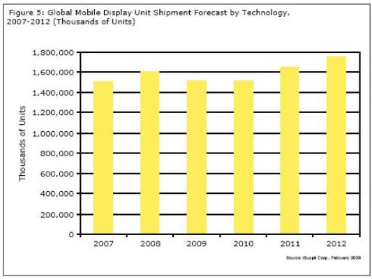 圖5所示為iSuppli公司對于2007-2012年手機(jī)顯示器市場的預(yù)測。