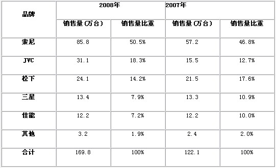 表2  2007-2008年中國數碼攝像機市場品牌銷售量結構