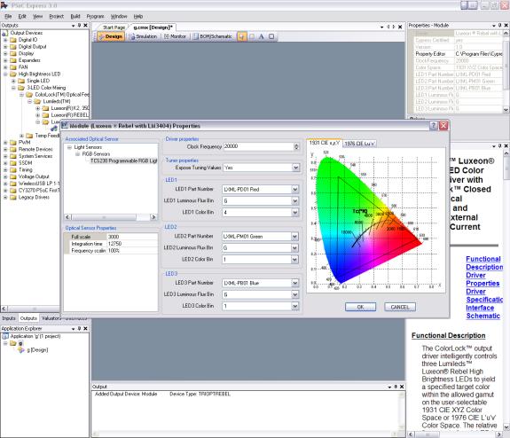 許多色彩系統設計擁有不同的回饋方法,需要花數個月的時間來開發韌體。解決bin的調整、溫度補償、或更高精準度的色彩回饋系統以及校正,都需要了解色彩科學以及精準的傳感器讀數。在展開任何高亮度LED設計時,強烈建議您先了解這些相關名詞。幸運的是,當您進入市場時,能利用Cypress Semiconductor所提供快速且輕易的PSoC Express 3.0解決方案,協助您快速展開研發。所有這些不同的回饋解決方案,以及高亮度LED的補償機制,都收錄在一個簡單易用的圖形化接口,讓您僅須使用下拉式選單以及各種校正技巧,就能完成這些設計。