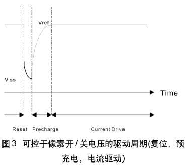 PMOLED彩色顯示要求的驅動機理和信號互換系統非常復雜。SSD1338的驅動器采用復用的尋址算法,每個驅動周期由放電(復位),電壓預充電和電流驅動三個階段組成(如圖3所示)。