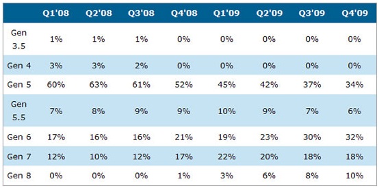 在2009年第二季,85%的筆記本電腦面板在5代線生產,而有11%在4代線或4代線以下生產,4%則在6代線生產。玻璃厚度成為筆記本電腦面板生產最關鍵的問題之一,而在5代線生產最為理想。根據面板廠的生產策略來看,生產比例規劃在接下來幾個季度將保持平穩。