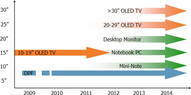 隨著技術(shù)進(jìn)步,DisplaySearch預(yù)估AMOLED將進(jìn)一步朝中大尺寸方向發(fā)展。筆記本計(jì)算機(jī)將是AMOLED廠(chǎng)商下一個(gè)關(guān)注的應(yīng)用方向,我們估計(jì)自2010年年中,廠(chǎng)商將有機(jī)會(huì)將AMOLED應(yīng)用在筆記本計(jì)算機(jī)上,而采用AMOLED面板上網(wǎng)本將有機(jī)會(huì)于2010年底開(kāi)始量產(chǎn)。在TV方面,我們預(yù)期2010年底將會(huì)有大于20寸AMOLED TV被生產(chǎn),同時(shí)預(yù)期2011年大于30寸AMOLED TV 將會(huì)進(jìn)入市場(chǎng)中。