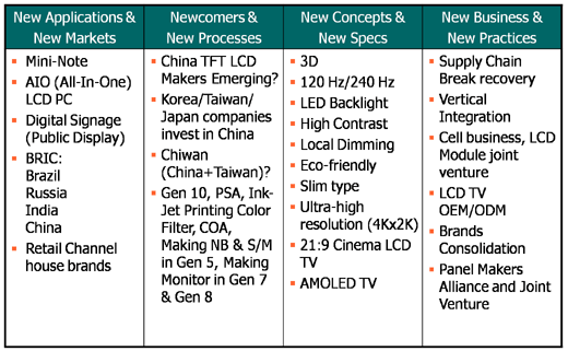 在接下來的十年將有八種因素主導(dǎo)著平面顯示器的成長: 新應(yīng)用與新市場、新廠商與新制程、新潮流與新規(guī)格、新商業(yè)模式與新實踐方式(如圖二)。其中有許多項目是來自于各平面顯示器廠商在2008年底與2009年初這波景氣衰退中所得到的啟示;需求下滑與競爭日益激烈迫使廠商不斷的尋找新的策略、新的市場與新的解決方法,同時推動平面顯示產(chǎn)業(yè)不斷地前進。