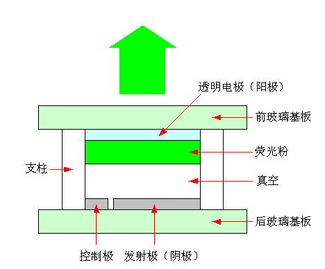 由于金屬電極是沿著同一塊玻璃基板排列,所以剛發射出來的電子是在玻璃基板表面傳導的,這是這種器件被命名為表面傳導電子發射顯示器的原因,這也是SED顯示器與其它場致發射顯示器的主要區別。SED電視目前的最大亮點是畫質好,它的解析度與液晶電視基本相同,而灰度表現力,可視角度,色域范圍,動態畫面表現,暗部細節表現力等,均可達到高級的CRT電視水平。由于SED生產技術基本上被東芝公司壟斷,因此,SED顯示器在未來十幾年內不可能發展成為主流產品。圖7是SED顯示器的工作原理。