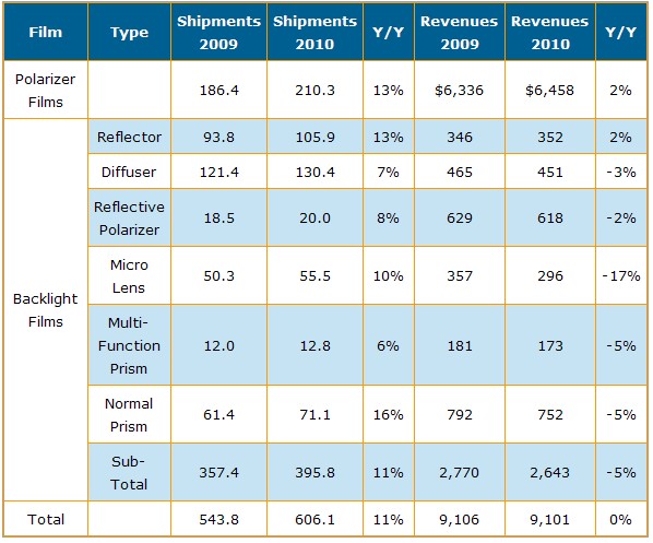 根據DisplaySearch在光學膜領域調研指出,2009年全球TFT LCD用光學膜出貨面積估計達到5億4千3百萬平方米,同時預估2010年光學膜出貨將持續增長到6億零6百萬平方米,年成長率將達11%。不過由于平均銷售價格不斷下滑,我們估計2010年出貨金額將與今年持平在91億美元水平。另一方面隨著綠色顯示器需求與LED背光市場增長驅動新一波背光設計發展,使得如棱鏡片(prism films)、反射式偏光片(reflective polarizers)或者micro-lens films等產品的需求也跟著提高;對于能持續提高技術能力的廠商提供較佳市場機會。