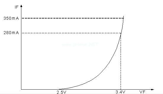 目前的新技術使LED能夠達到很高的功率水平,LED的功率能夠達到1W,甚至有些達到5W,光效達到60-85LM/W,這種LED設備稱為高亮LED(HB-LED)。目前我們用在照明上LED都是HB-LED,一般都是選擇1W的LED通過串并聯的方式組成大功率LED燈,尤其以串聯為主。這種LED的為3.4V±2%,正向電流為350mA左右。其-曲線如圖1.1所示。