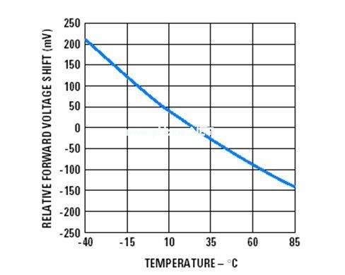 從圖1.2可以看出,隨著溫度的上升,會逐漸變小,相反,當溫度降低時,會增加。當LED的溫度上升到85度時,已經有變成3.25V(3.4V-0.15V),相反當LED溫度降到-40度時,變成3.6V(3.4V+0.2V)。