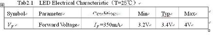其次,恒功率控制都是預先假定輸出功率是恒定的,比如用9個1W(=3.4V, =350MA)的LED串聯起來用做一個9W的PAR燈,那么設計時候就會用=9W來計算。但實際上每個LED的都會偏差,偏差值如表2.1所示: