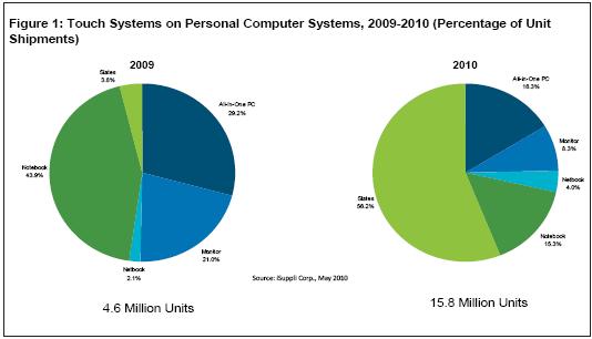 最近幾年,個人電腦市場對于觸摸屏的需求不斷增長,2008和2009年增長率超過20%,快于總體系統市場。但與該市場2010年462%的增長率相比,上述增長速度就相形見絀了。平板觸摸電腦是PC觸摸革命中的主要初期推動者,預計占PC觸摸市場的比例將從2009年的3.8%銳升到56.2%,而總體PC觸摸市場規模將擴大兩倍。