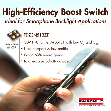 FDZ3N513ZT是升壓轉換器中的主要元件,用以驅動串聯白光LED,為智能電話的顯示屏(以及按鍵,如果有鍵盤的話)提供照明。