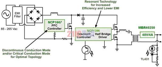 2)基于NCP1607和NCP1397的超高能效大功率LED街燈電源方案近年來,業界對超高能效的LED照明拓撲結構興趣日濃,期望在功率電平相對較低(<50W)時提供高于90%的能效,這個能效目標甚至比“能源之星”2.0版外部電源能效要求(功率不超過49W時能效高于87%)更高。要達到這樣高的能效,需要采用新的拓撲結構,如從反激拓撲結構轉向諧振半橋拓撲結構,從而充分發揮零電壓開關(ZVS)的優勢。有利的是,安森美半導體早已著手開發能用于LED驅動電源的高能效半橋解決方案,如NCP1396及其升級版NCP1397高性能諧振模式控制器。NCP1397內置高端和低端驅動器,支持可調節及精確的最低頻率,提供極高能效,并具備多種故障保護特性?;贜CP1607PFC控制器和NCP1397雙電感加單電容(LLC)半橋諧振控制器的LED電源方案(見圖2)非常適合功率在50到300W范圍的高能效LED街道照明應用。[page]