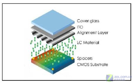 LCOS面板的結(jié)構(gòu)有些類似TFTLCD,一樣是在上下二層基板中間撒布Spacer以加以隔絕后,再填充液晶于基板間形成光閥,藉由電路的開關(guān)以推動液晶分子的旋轉(zhuǎn),以決定畫面的明與暗。LCOS面板的上基板是ITO導(dǎo)電玻璃,下基板是則矽晶圓CMOS基板,LCOS面板最大的特色在于下基板的材質(zhì)是單晶矽,因此擁有良好的電子移動率,而且單晶矽可形成較細(xì)的線路,因此與現(xiàn)有的HTPSLCD及DLP投影面板相較,LCOS是比較容易達(dá)成高解析度的投影技術(shù)。