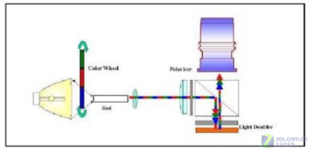 單片式ColorWheel光學(xué)引擎則是以快速旋轉(zhuǎn)的ColorSwitch將白光形成循序的紅、藍(lán)、綠光,并將三原色光與驅(qū)動程式產(chǎn)生的紅、藍(lán)、綠畫面,同步形成分色影像,再藉由人眼視覺暫留的特性,最后在人腦產(chǎn)生彩色的投影畫面。類似的技術(shù)有:Displaytech發(fā)表的FieldSequentialColor、Philip所采用的ScrollingColor-RotatingPrism架構(gòu)、及JVC采用的SpatialColor–Hologram架構(gòu)。[page]