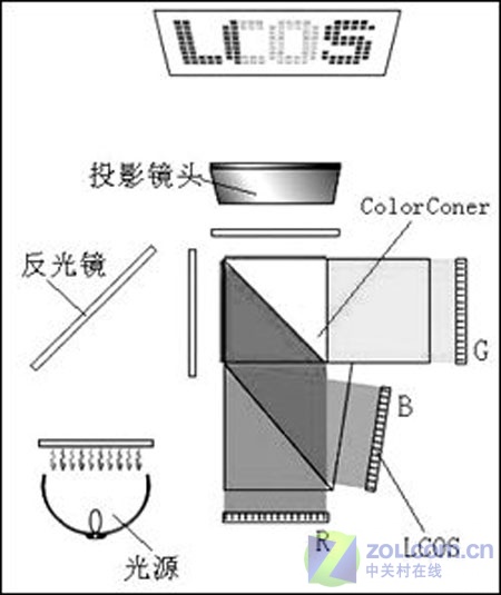 投影機(jī)技術(shù)基本顯影原理相仿,主要是由鹵素?zé)簟㈦瘹鉄舻劝l(fā)光,集光至面板,將面板的影像經(jīng)反射或透射投射出影像,再經(jīng)過分光、合光系統(tǒng),最后將影像投射到屏幕顯像。LCOS(LiquidCrystalonSilicon)是一種全新的數(shù)碼成像技術(shù),它采用半導(dǎo)體CMOS集成電路芯片作為反射式LCD的基片,CMOS芯片上涂有薄薄的一層液晶硅,控制電路置于顯示裝置的后面,可以提高透光率,從而實(shí)現(xiàn)更大的光輸出和更高的分辨率。