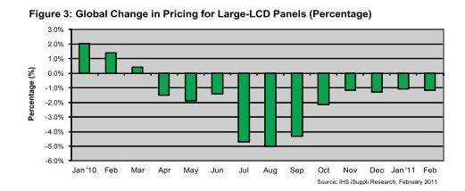 預(yù)計(jì)2月份大尺寸LCD電視面板價(jià)格下降1.2%。但是,10月以來價(jià)格下滑速度不斷放緩,2月降幅是2010年6月以來最小。未來兩個(gè)月面板價(jià)格可能保持平穩(wěn),4月將推出新款電視,而5月中國將迎來勞動(dòng)節(jié)假日。