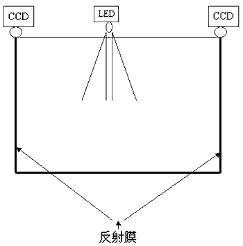 CCD光掃描原理是:在顯示區域的一邊設置兩個固定距離的CCD線陣探測器和紅外發射器,對準顯示區域。在顯示區域的另外三邊設置可以反射光線的反射膜,在沒有物體阻擋時,線陣CCD檢測到的是一條完整的光帶。當有物體在顯示區域中擋住光線傳播路徑時,在線陣CCD檢測到的光帶中會出現無反光區域,分布在兩個角的CCD分別檢測到的遮擋區域反應在線陣CCD的對應區域,根據對應的區域計算出物體在顯示區域的位置,是一種交叉點測試定位方式。