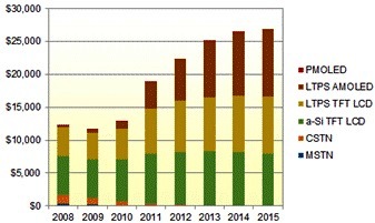 盡管如此,對比2009年2,980萬片出貨量,LTPS面板成長速度仍不如a-si面板,主要是受到產(chǎn)能的限制。DisplaySearch預(yù)測,LTPS面板將朝較大尺寸智能手機(jī)市場發(fā)展,預(yù)計產(chǎn)能也將逐步增加。