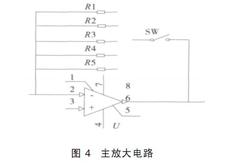 由仿真結果可以看出光電二極管產生的微安級的弱光電流經前置放大電路可輸出毫伏級的電壓,所以仍需通過主放大電路進行后續處理。 主放大電路如圖 4 所示; R 1~ R 5 電阻可實現電壓放大倍數的多檔可調,即所謂的靈敏度調節。