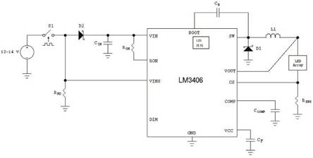 對于此應用的調光和閃光部分,可以使用多種方法降低向LED陣列提供的功率。最常用的一種方法是脈寬調制調光,這種方法通常使用專門的邏輯信號高速開啟和關閉LED以控制總體光輸出。這種方法簡單有效,但可能極少用于汽車電子系統應用,因為在線束中需要一根額外的線路用于調光信號。另一種方法稱為雙線調光,向LED驅動器提供的電源定期中斷以控制調光。1.5A整體式開關穩壓器LM3406具有此功能,其真實電流平均值實現更嚴密的光輸出控制。集成的N通道MOSFET不提供控制器集成電路具有的靈活性,因此降低了板上的復雜性。圖8顯示了使用雙線調光方法的LM3406應用示例。