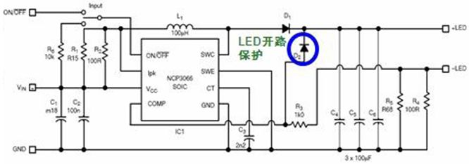 圖5:基于NCL30010的1-30 W DC-DC LED降壓應用