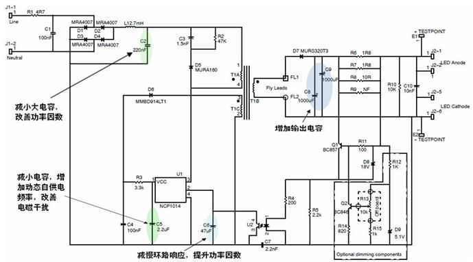 圖6:改善了功率因數的NCP1014應用電路圖