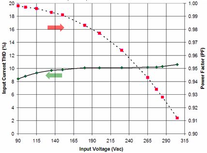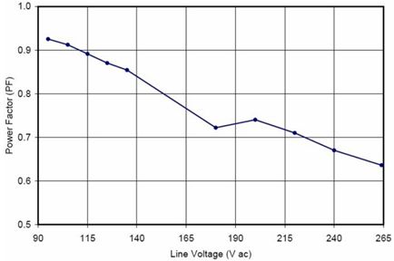 在針對商業照明的應用中使用的是寬動態范圍的精確導通時間控制器方案NCL30000。設計中采用控制器(外置FET等旁路元件)方案的原因包括易于在能效和成本之間實現折衷、能以單顆控制器支持寬功率范圍(5到30 W)、及便于優化散熱及靈活布線等?;贜CL30000構建的90到305 Vac EFD25演示板(Vout = 12 LED, 37 Vdc)測試顯示,功率因數遠高于0.9,部分輸入電壓條件下功率因數甚至高于0.95(見圖9),能效也極高。