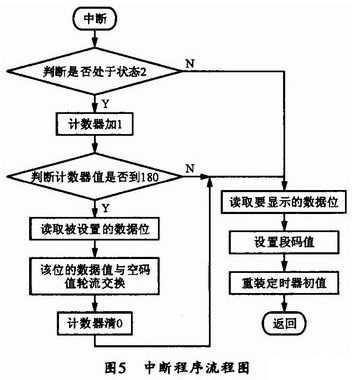 在狀態2下,參數設定時,設定位要實現閃爍,以確定正在被設置的數據位。實現閃爍的基本思想是每隔500 ms,當前閃爍數據位的段碼值就由數據狀態變為空碼狀態,下一個500 ms再由空碼狀態變為數據狀態,并不斷循環執行此操作(共陽極顯示方式下空碼值為0XFF)。這樣,從用戶角度看,當前被設定的數據位就是閃爍的。這里可通過設定一個計數器來確定轉換時間,當計數值達到500/2.78(約為180)時,當前閃爍數據位就進行段碼值轉換。本系統的中斷程序流程圖如圖5所示。
