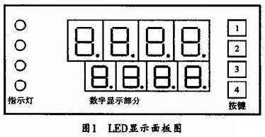 本文的LED通用智能型顯示面板如圖1所示。該面板中央為兩排LED數碼管,每排4位。上排為紅色,下排為綠色。面板左邊為四個發光二極管,右邊為四個按鍵開關。其顯示和開關可根據不同應用定義。