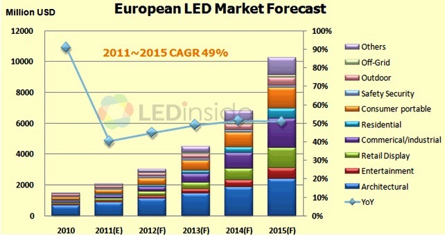 根據(jù)LEDinside調(diào)查, 2011年歐洲 LED照明市場約達(dá)20億美元以上,大約占全球 LED照明市場28%。盡管歐洲市場因?yàn)闅W債而在 2011年有受到影響,但歐盟已經(jīng)積極解決,也反應(yīng)在市場上,隨著LED規(guī)格不斷的提升及大幅度降價(jià)等影響,LEDinside預(yù)估歐洲 LED照明市場每年都將會有大幅度成長,2015年歐洲 LED照明市場將會突破100億美元規(guī)模。