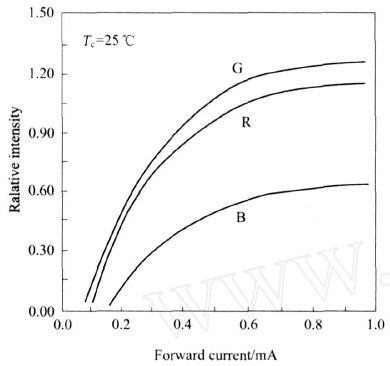 從圖2 的IF 與L 曲線可知, IF 的大小直接影響了L 。當IF 達到一定值以后,L 基本趨于飽和。根據圖1 和圖2 的VF 、IF 和L 特性,在實際中通常用VF 的方式驅動LED ,用串連電阻值的大小調整LED 的RGB 三基色的IF 使其L 一致。而系統對RGB 三基色的IF 的調整,是以常溫為基本的標準。