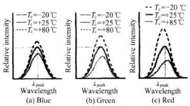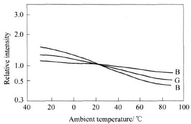 但從LED 的亮度特性圖3 可知,隨著環境溫度TC 的變化,L ED 的RGB 三基色的顯示亮度偏移狀況各不相同,B 的飄移較小,而R 的飄移較大,當溫度超過80 ℃時,R 相對亮度的變化幾乎是常溫時的2 倍。這種變化完全破壞了常溫時設置的白平衡,使整個顯示屏的色度發生嚴重漂移,圖像質量變差。RGB 三基色的相對亮度的偏移如圖4 示,可明顯看出,常溫時三基色的亮度狀態和在85 ℃及- 20 ℃時的相對亮度值,正是L ED 的溫度特性導致冬季和夏季顯示屏的圖像質量變差。