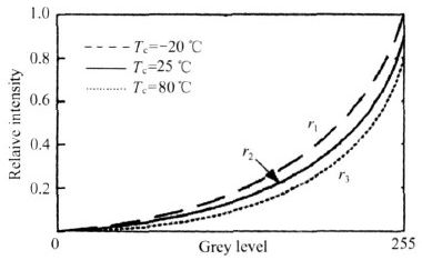 但此方法將損失低灰度級的亮度,降低了圖像的灰度級,即降低了圖像顯示色彩。為了不減少低級灰度且保證對亮度的調整,提出一種針對每個溫度段采用不同的Gamma 參數來調整相關色彩亮度的技術,以補償環境溫度對器件的影響。系統針對不同的RGB 的基色設置其獨立的Gamma 反校正參數。