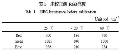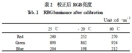 表1 中,常溫的白場配色比例為1. 92 ∶6. 57 ∶1. 51。而當溫度發生變化時,由于LED 的特性,使RGB 的亮度特性發生了嚴重的偏移,使白場的比例已完全偏離了常溫下的比例,使圖像在色彩發生了畸變。而采用本文的校正技術后,結果如表2 所示。