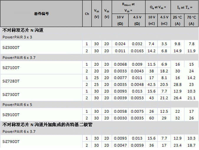 下表提供了所有五款新器件及SiZ710DT的詳細(xì)性能規(guī)格。