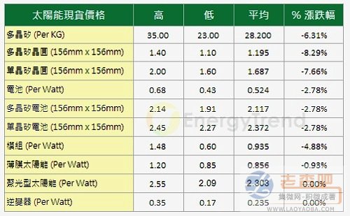 而在電池方面,最低價格仍來到每瓦0.43美元,平均價格則滑落到每瓦0.524美元,跌幅為2.78%;另外在模組方面,雖然矽晶太陽能模組的平均價格持續下滑到每瓦0.935美元,跌幅為4.88%;而薄膜部分也是下滑的狀況,平均價格來到0.856美元,跌幅為0.93%。