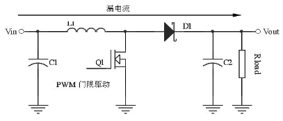 (1)電池使用壽命短:圖2 中,即使關斷升壓轉換器主開關,Vin 與Vout 之間仍會形成一條電流泄露路徑,如果在輸出端接有任何負載,其中泄露電流Ileak 接近于Vin/Rload,那么漏電流的存在使的蓄電池一直處于工作狀態(tài),這樣將會縮短電池的使用壽命。