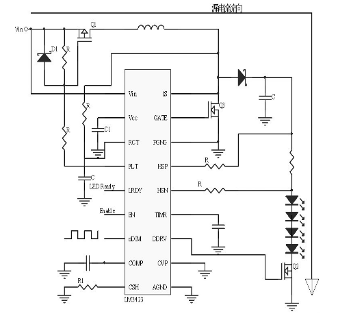 美國國家半導體研發(fā)的LM3423 芯片輸入電壓范圍在4.5V 到75V之間,適用于極寬的輸入電壓范圍;50KHZ 的快速PWM調(diào)光;內(nèi)部基準電壓50mV- 1.25V;工作頻率最大可達到1MHZ;內(nèi)部驅動能力750mA,超低電流停機小于2uA.可以用來配置升壓、浮動降壓、浮動降壓/ 升壓和SEPIC 拓撲結構中低側外部MOSFET的控制器;使用峰值電流模式控制器和預測性關閉時間設計來調(diào)節(jié)LED 電流,峰值電流模式控制器與預測性關閉時間設計的組合簡化了回路補償設計,同時提供內(nèi)在的輸入電壓前饋補償;設有用于控制外部調(diào)光FET 和系統(tǒng)"零電流"關閉特點的集成驅動器;并且具有LED 狀態(tài)輸出標記、故障標記、可編程故障計時器和邏輯針腳,用于控制調(diào)光驅動器的極性。