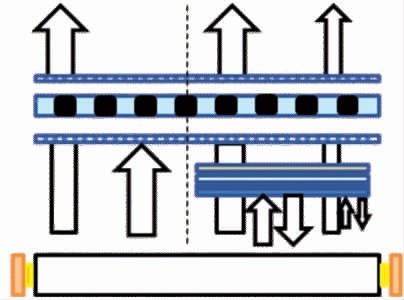 為了使用盡可能少的LED而又保持良好的光學特性,本文設計的LED背光選用了1層擴散膜、2層棱鏡膜和1層雙層增亮膜(DBEF),膜材參數如表1所示。擴散膜可以改變LGP出射的光路,讓射出的光更加均勻;還可以隱藏LGP 上的dot,使從正面看不到散射點的影子,擴大視野角,提升輝度。棱鏡膜即增亮片,主要利用全反射和折射定律,將分散的光集中于一定角度范圍內出射,從而提高該范圍內的亮度。DBEF 是本文LED背光模組的關鍵膜材,可以使整個模組的亮度提升一倍,其工作原理如圖2所示。DBEF可以將不能通過下偏光片的光線反射回背光,經背光的二次反射,部分光線又可以通過DBEF和下偏光片出射。經過多次回收和利用,光的透過率得以大幅提高。