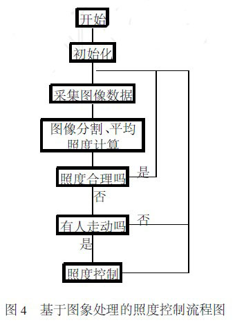 基于圖像處理的程序流程圖如圖4 所示。初始化系統(tǒng)后, 經(jīng)過(guò)采集圖像數(shù)據(jù), 將采集來(lái)的數(shù)據(jù)進(jìn)行計(jì)算:先進(jìn)行圖像分割, 然后進(jìn)行圖像特征提取,區(qū)分亮區(qū)和暗區(qū), 計(jì)算平均照度。判別照度值是否符合要求:如果照度值符合要求, 重復(fù)采樣圖像數(shù)據(jù); 如果照度值不符合要求, 就輸出控制信號(hào)來(lái)調(diào)節(jié)燈的亮度, 之后, 重復(fù)采樣圖像數(shù)據(jù), 進(jìn)行下一個(gè)循環(huán)。