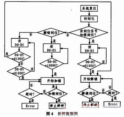 如圖2所示,單片機通過讀取外來信號D0—D5,程序內部判斷后對鎖定機構進行加鎖或解鎖控制,控制信號通過SN54LS245驅動后,控制圖3中繼電器的吸合來控制電機工作。沒有加解鎖控制信號或到位信號輸入時,繼電器K1、K2、K3、K4都處于3、4和9、10導通狀態;當信號控制時,繼電器K1、K2、K3、K4處于4、5和8、9導通狀態。