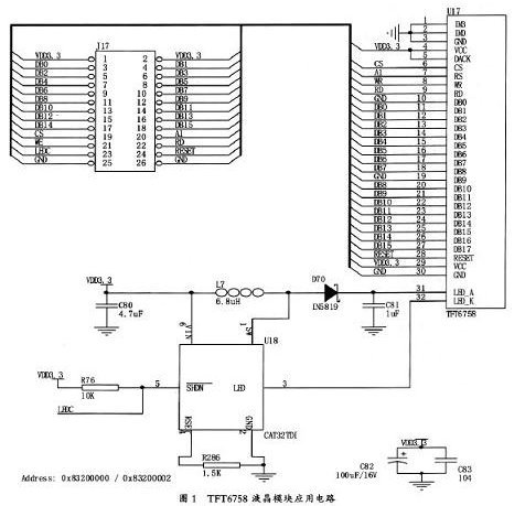 TFT 液晶接口電路采用PACK板形式與主板連接, 其接口定義如圖1 所示。將TFT6758 液晶顯示模塊的RESET 引腳連接到J1 連接器上, 使用LPC2292 的P0.22 控制液晶模塊復位。TFT6758 液晶顯示模塊的CS、WR 和RD 引腳均連接到J1 連接器上, 與主板的LPC2292 的片選、寫和讀信號連接。而RS 引腳則使用A1 連接, 當A1 為高電平時為數據操作, 當A1 為低電平時為命令( 索引) 操作,即使用兩個不同的地址來區別向TFT6758 液晶模塊發送命令還是發送數據。TFT6758 液晶模塊片選信號: LCM_nCS0; 0x83200000~0x833FFFFF; 索引/ 指令操作地址為: 0x8320000; 數據操作地址為:0x83200002。