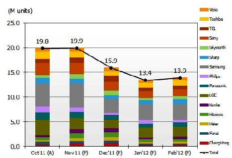 NPD DisplaySearch認為,盡管北美和中國大陸的銷售實績強勁,液晶電視品牌商仍謹慎管控庫存。從12月到 2012年2月,液晶電視品牌計劃降低生產數量以預防在傳統的第一季淡季堆積過多的庫存。在全球液晶電視品牌生產計劃調查中顯示, 2012年1月的整機生產量將降到1,340萬臺的數量,而液晶電視面板業者則將需在未來的幾個月持續控制產能利用率,即使面板價格轉為穩定。
