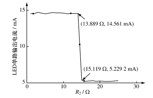 為驗證輸出保護電路的功能,對電阻R2 進行參數(shù)掃描分析,之后進行性能分析。結果如圖3所示。可以看出,當R2 從1 Ω 增大到13. 889Ω時,輸出電流開始下降,表明此時單向晶閘管處于臨界導通狀態(tài);然后隨著R2 的繼續(xù)增大,輸出電流急劇下降,直至R2 為15. 119Ω時,輸出電流穩(wěn)定在5. 2 mA 左右,表明單向晶閘管已經(jīng)完全導通,保護電路已經(jīng)起作用。