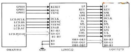 LZ9FC22和OMAP5910的LCD控制器連接,由于LZ9FC22是18位控制器(RGB信號各有6位),而OMAP5910的LCD控制器的輸出只有16位數據,為此必須損失兩位數據,將LZ9FC22的R0和BO接地,或者將R0和R5、BO和B5連接在一起。