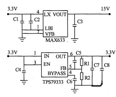 LQ035Q7D面板顯示需要15V的高壓,而LQ035Q7D的邏輯電平需要3.3V電源。圖3實現從3.3V轉換到15V和3.3V的電源原理。其中3.3V到3.3V使用TI公司的TPS79333,是為了保證輸出到LCD的3.3V穩定可靠,如果TPS79333的輸入3.3V足夠穩定,滿足LQ035Q7D的要求,也可以直接將該電源連接到LCD。