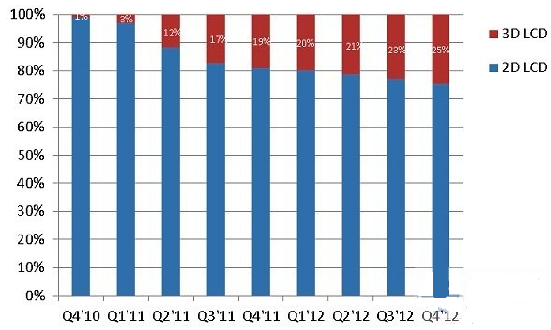 根據(jù)NPD DisplaySearch的調(diào)查,在元旦期間的主要城市賣場,3D液晶電視在零售終端滲透率甚至高達40%;而整體3D液晶電視出貨滲透率可望在2012年第一季超過20%;該機構(gòu)在全球電視出貨與預(yù)測季報(Quarterly Advanced Global TV Shipment and Forecast Report)中預(yù)測,到2012年第四季,中國大陸 3D液晶電視滲透率可達25%。