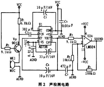 從麥克風接收到信號后由三極管9013初次放大,然后由集成放大器LM324的兩級放大,得到交流電壓。由于模數轉換時需要直流電壓值,所以再通過萬用表交直流轉換電路,選用整流芯片AD736,使用單電壓供電低阻抗電路。