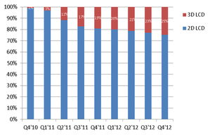 過去一年,雖然國際市場需求下降,但是中國彩電市場仍保持穩定成長。而2012年中國3D頻道的開播,不僅將3D電視熱潮推到更高,也成為拉動彩電銷售增長的一個新亮點。根據NPD DisplaySearch報告指出,2012年第四季中國3D電視滲透率可達25%。