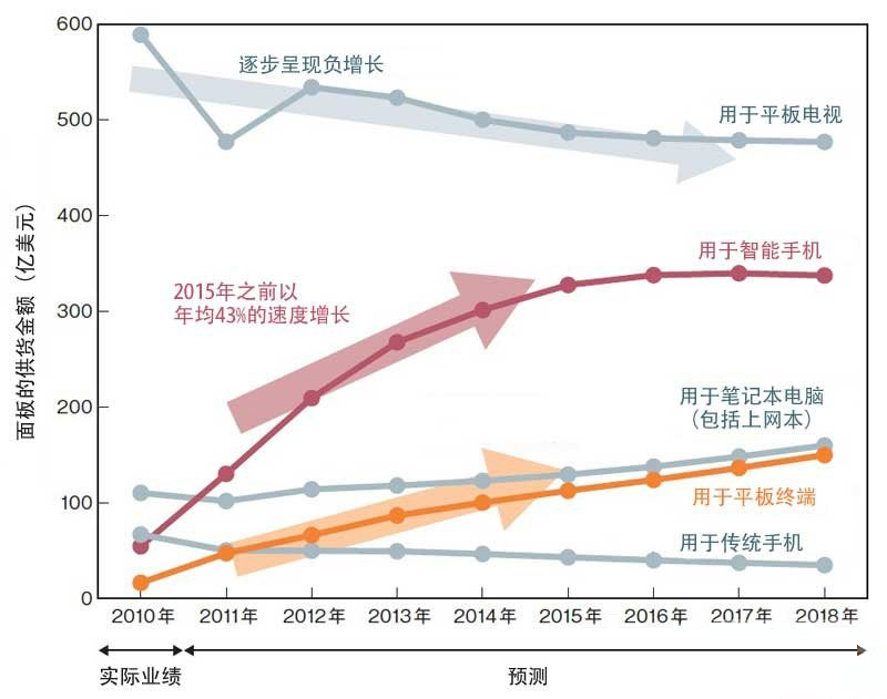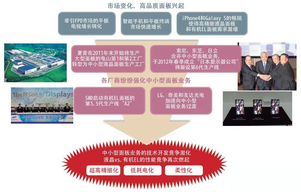 日韓臺的面板廠商開始將業(yè)務(wù)重心從電視機用大型面板轉(zhuǎn)向智能手機和平板終端使用的中小型面板。今后,技術(shù)開發(fā)競爭將越來越激烈。